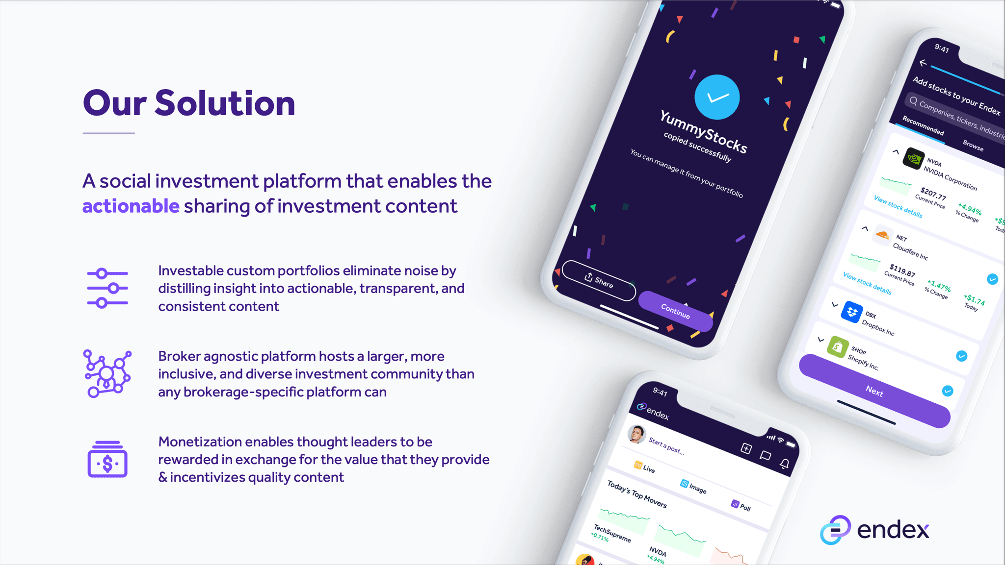 My Co-founder and I co-founded Endex in 2021 to democratize investing by offering tools for creating shareable portfolios, engaging with like-minded investors, and monetizing investment content. The app enabled direct ownership of stocks and ETFs, and helped users to not only make adjustments based on critical events and market conditions, but also participate in the social aspects of investing through voting and exerting price pressure.